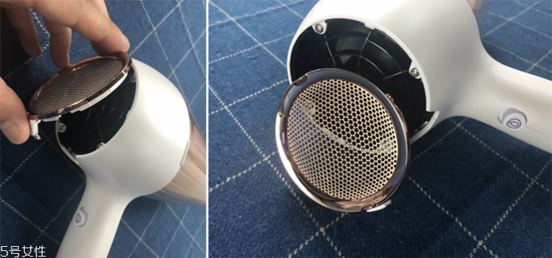 入風(fēng)口展示:背部入風(fēng)口的金屬細(xì)密網(wǎng)面可以防止頭發(fā)卷入,也能取下來。