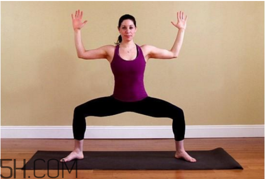 分腿站立伸展式準備,抬起上半身。腳跟內(nèi)收,彎曲膝蓋,向下蹲直至股四頭肌與地面平行。收緊尾椎骨,保持肩部處于臀部正上方。